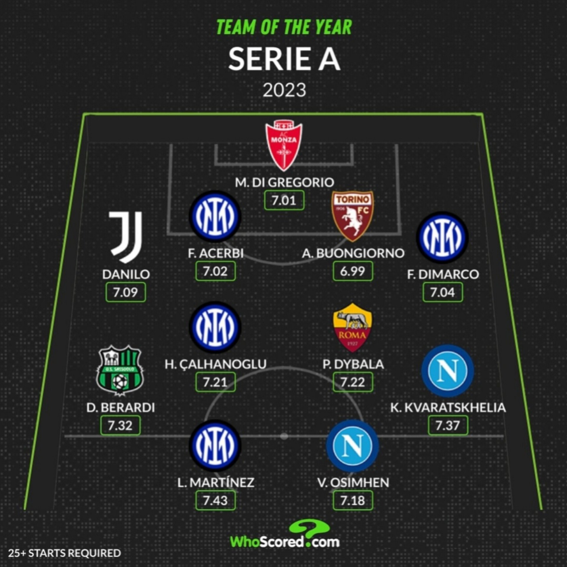 გამოცემა "WhoScored"-მა 2023 წლის სერია ა-ს საუკეთესო გუნდი შეადგინა, სადაც "ნაპოლის" ქართველი შემტევი, ხვიჩა კვარაცხელიაც მოხვდა.