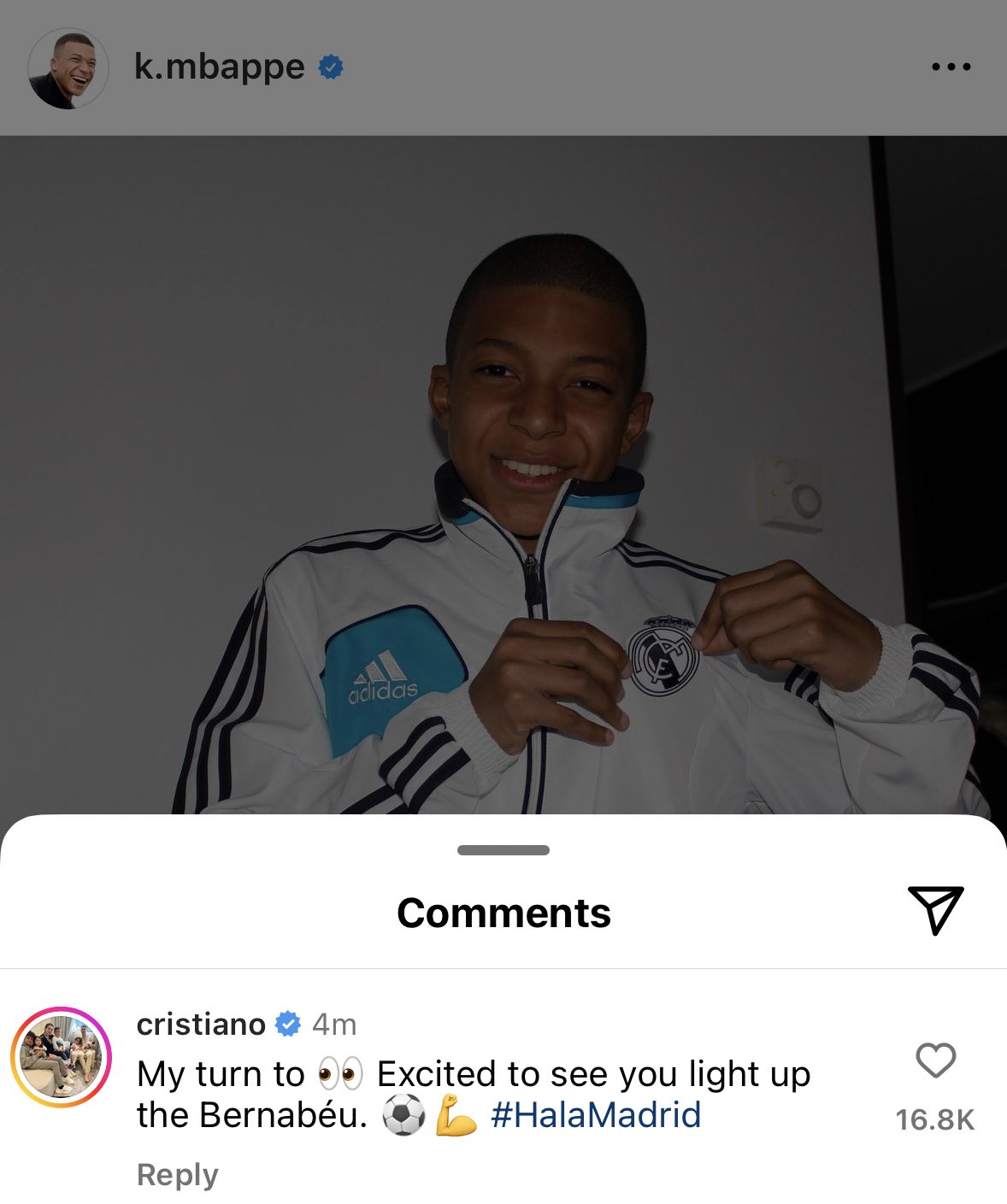 მან კომენტარი მბაპეს ინსტაგრამ პოსტზე დაწერა, რომელშიც ის "რეალში" ტრანსფერს აღნიშნავდა: