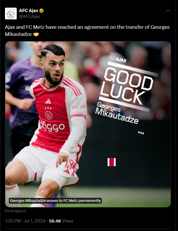 "აიაქსმა" და "მეცმა" მიაღწიეს შეთანხმებას მიქაუტაძის გამოსყიდვასთან დაკავშირებით. წარმატებები", - წერს გუნდი.