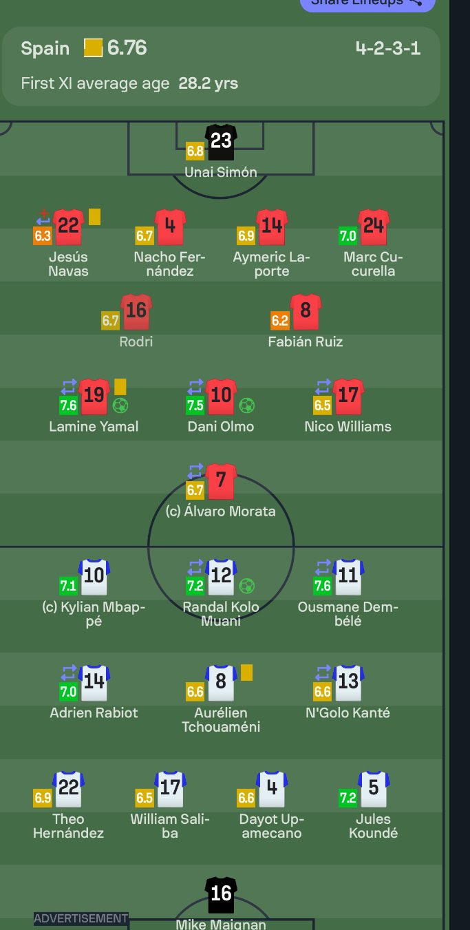 აღნიშნულ დაპირისპირებაში საფრანგეთის ნაკრები 1:2 დამარცხდა ესპანეთთან. ამ მატჩში გოლებით თავი გამოიჩინეს: კოლო მუანმა,(საფრანგეთი) იამალმა (ესპანეთი) და ოლმომ (ესპანეთი).
