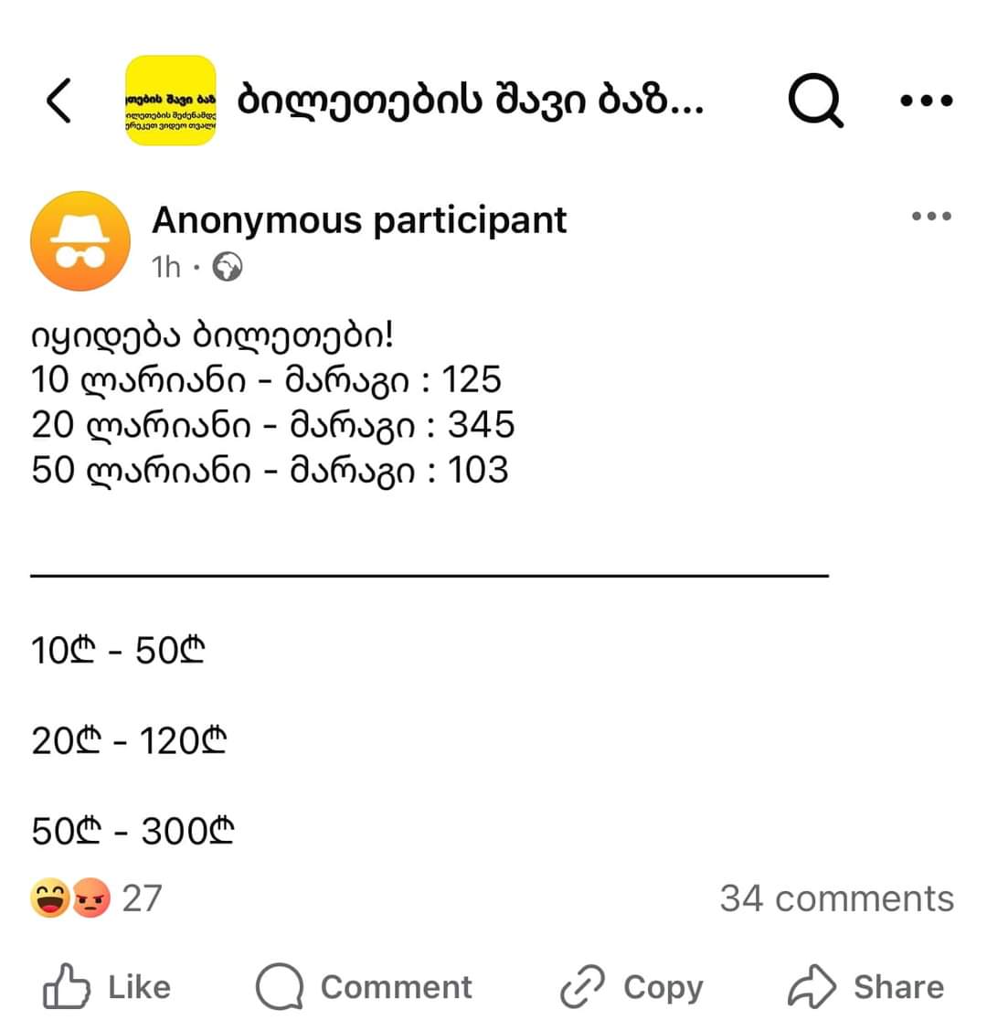 ბევრი ქომაგის უბილეთოდ დარჩენის ფონზე კი ერთ-ერთ ჯგუფში სტატუსი ვრცელდება, სადაც გადამყიდველი წერს, რომ 500-ზე მეტი ბილეთი აქვს გასაყიდად.