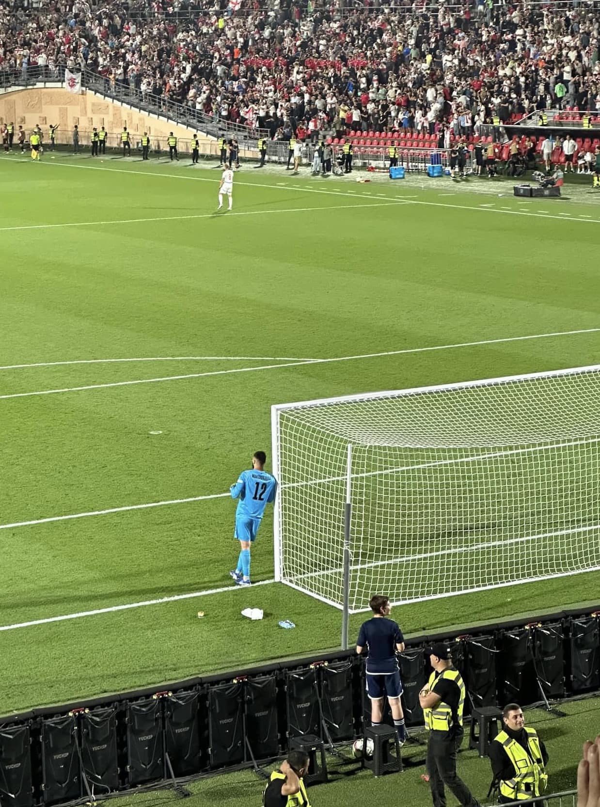 მატჩის მსვლელობისას გიორგი მამარდაშვილს ბევრი საქმე არ ჰქონია. ერთ-ერთ ფოტოში ის კარის ძელზეც კია მიყუდებული.