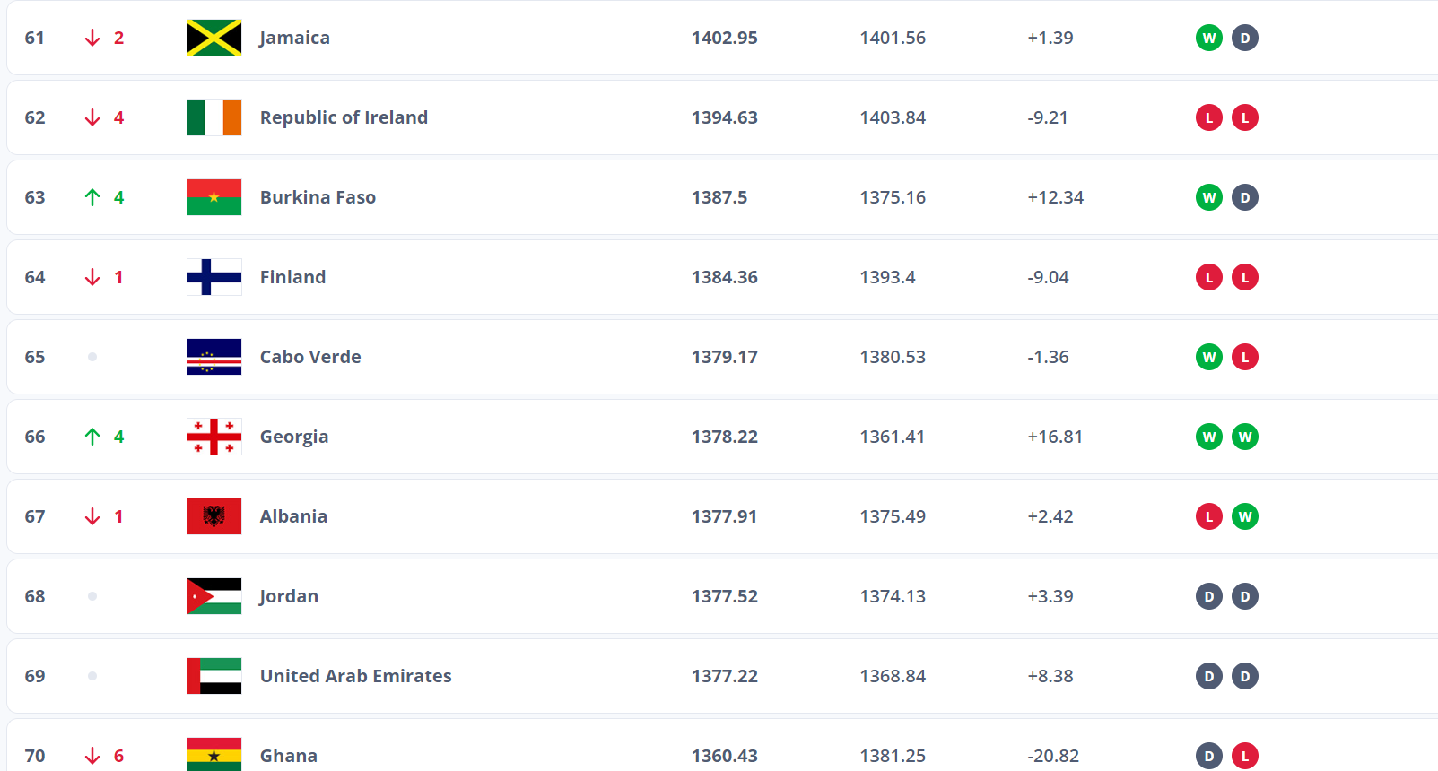 ჩეხეთისა და ალბანეთის ნაკრებების დამარცხების შემდეგ, საქართველოს ნაკრებმა რიგით 66-ე პოზიციაზე გადაინაცვლა და ალბანეთის ნაკრებსაც გადაასწრო.