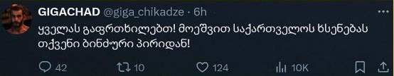 "ყველას გაფრთხილებთ! მოეშვით საქართველოს ხსენებას თქვენი ბინძური პირიდან", - წერს გიგა.