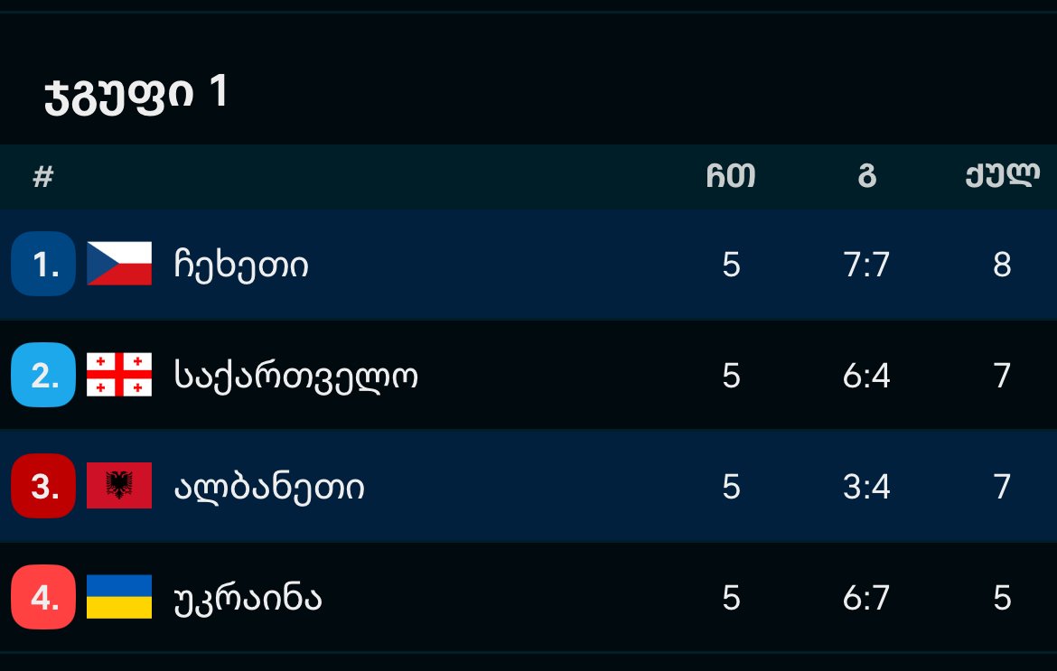 ამჟამად ჯგუფში ასეთი სიტუაციაა პირველ ადგილს 8 ქულით ჩეხეთი იკავებს, მეორე ადგილს 7 ქულით საქართველო, მესამე ადგილს 7 ქულით ალბენითი, ხოლო ბოლო ადგილზე 5 ქულით უკრაინა.
