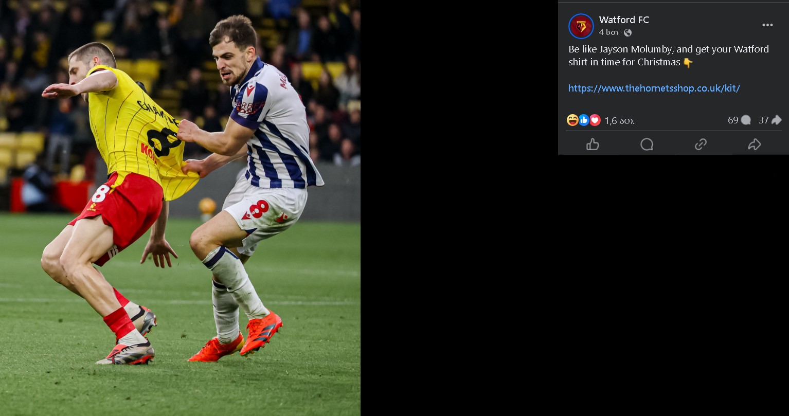 "მიბაძეთ ჯეისონ მოლუმბის და შეიძინეთ "უოტფორდის" მაისურები საახალწლოდ", - წერს კლუბის ოფიციალური გვერდი ჩაკვეს ფოტოზე სოციალურ ქსელში.
