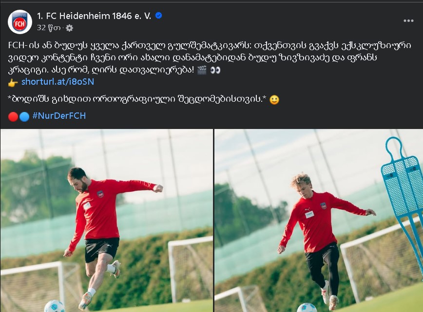 "ჰაიდენჰაიმის" ოფიციალურმა გვერდმა ბუდუ ზივზივაძის ტრანსფერის შემდეგ სოციალურ ქსელში პოსტი ქართულ ენაზე გამოაქვეყნა: