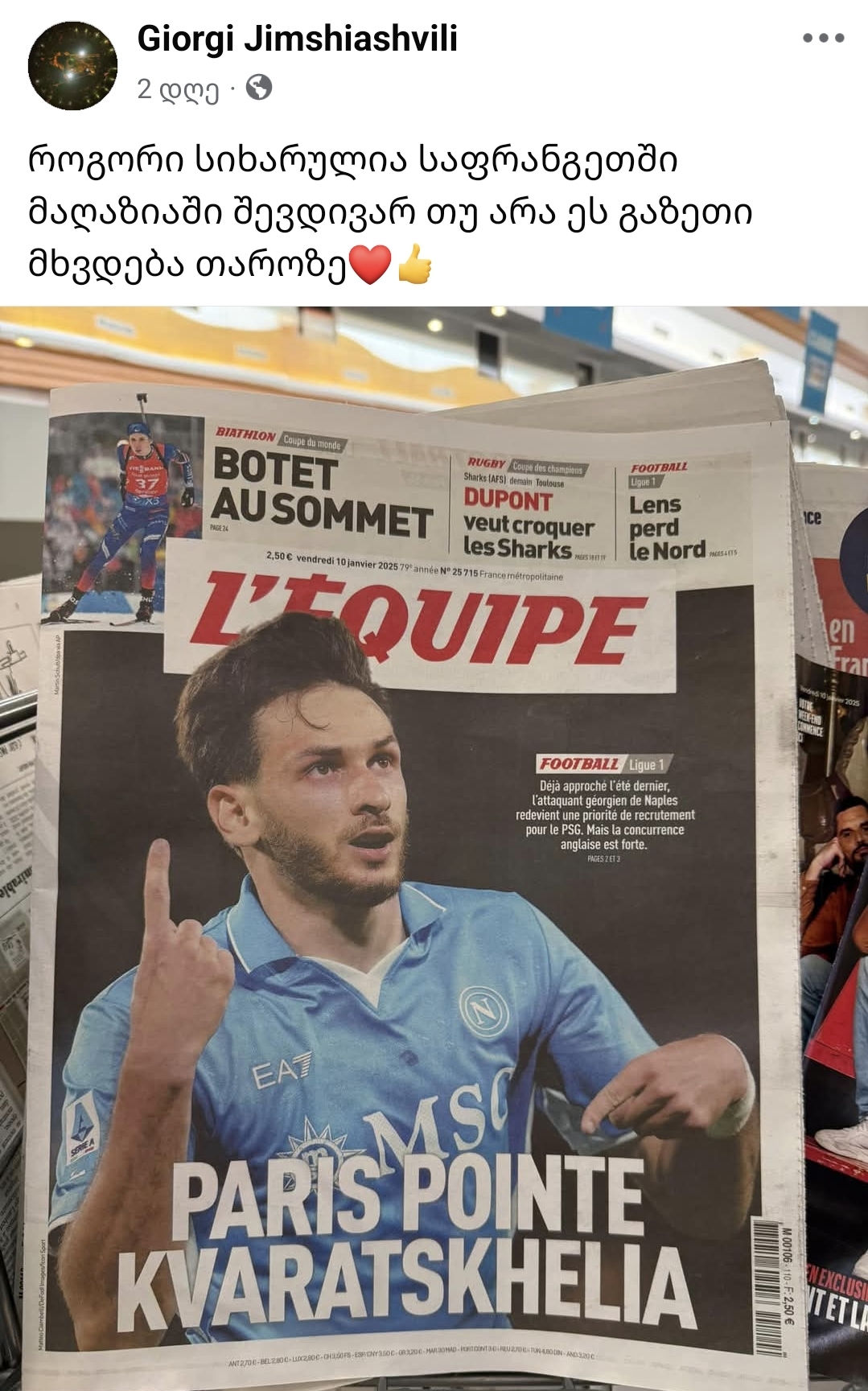 ერთ-ერთი საფრანგეთში მყოფი ქართველი ემიგრანტი, გიორგი ჯიმშიაშვილი სოციალურ ქსელში ხვიჩა კვარაცხელიაზე საინტერესო პოსტს აქვეყნებს: