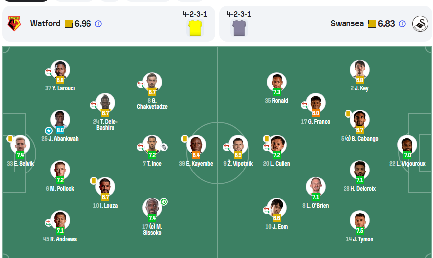 ჩემპიონშიპის 37-ე ტურში "უოტფორდი" "სვონსის" დაუპირისპირდა და მეტოქე 1:0 დაამარცხა.