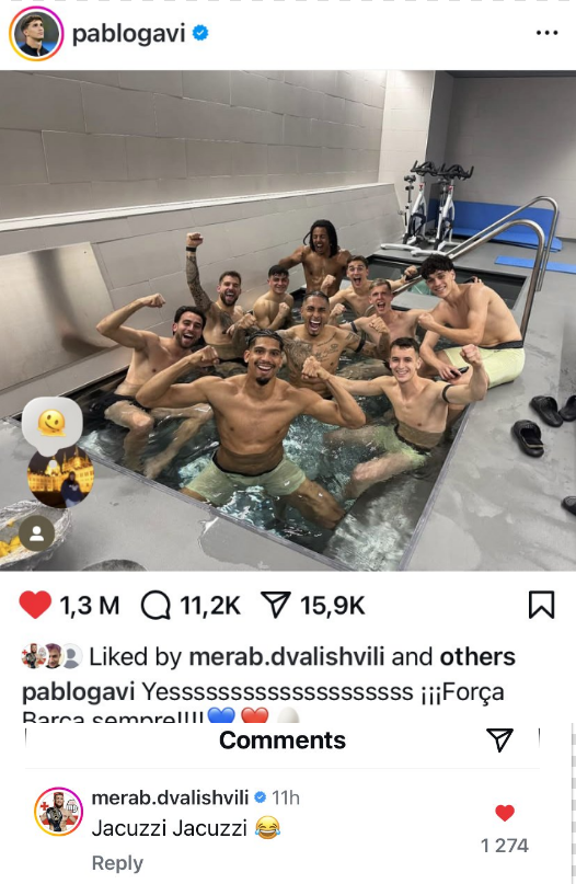 პაბლო გავიმ სოციალურ ქსელში “ატლეტიკოსთან” გამარჯვების შემდეგ ჯაკუზიში გადაღებული ფოტო განათავსა.