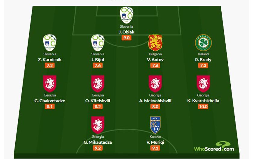 საერთაშორისო ანალიტიკურმა პორტალმა 4-4-2 სისტემით შედგენილი გუნდის თავდასხმაში გიორგი მიქაუტაძე (9,2) შეიყვანა, ხოლო ნახევარდაცვა მთლიანად საქართველოს ნაკრების ფეხბურთელებით შეადგინა – გიორგი ჩაკვეტაძე (8,1), ოთარ კიტეიშვილი (8,2), ანზორ მექვაბიშვილი (8,0) და ხვიჩა კვარაცხელია (10.0).