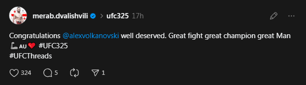 "გილოცავ @alexvolkanovski, დამსახურებულია. შესანიშნავი ბრძოლა, შესანიშნავი ჩემპიონი, შესანიშნავი ადამიანი", - წერს ქართველი მებრძოლი.