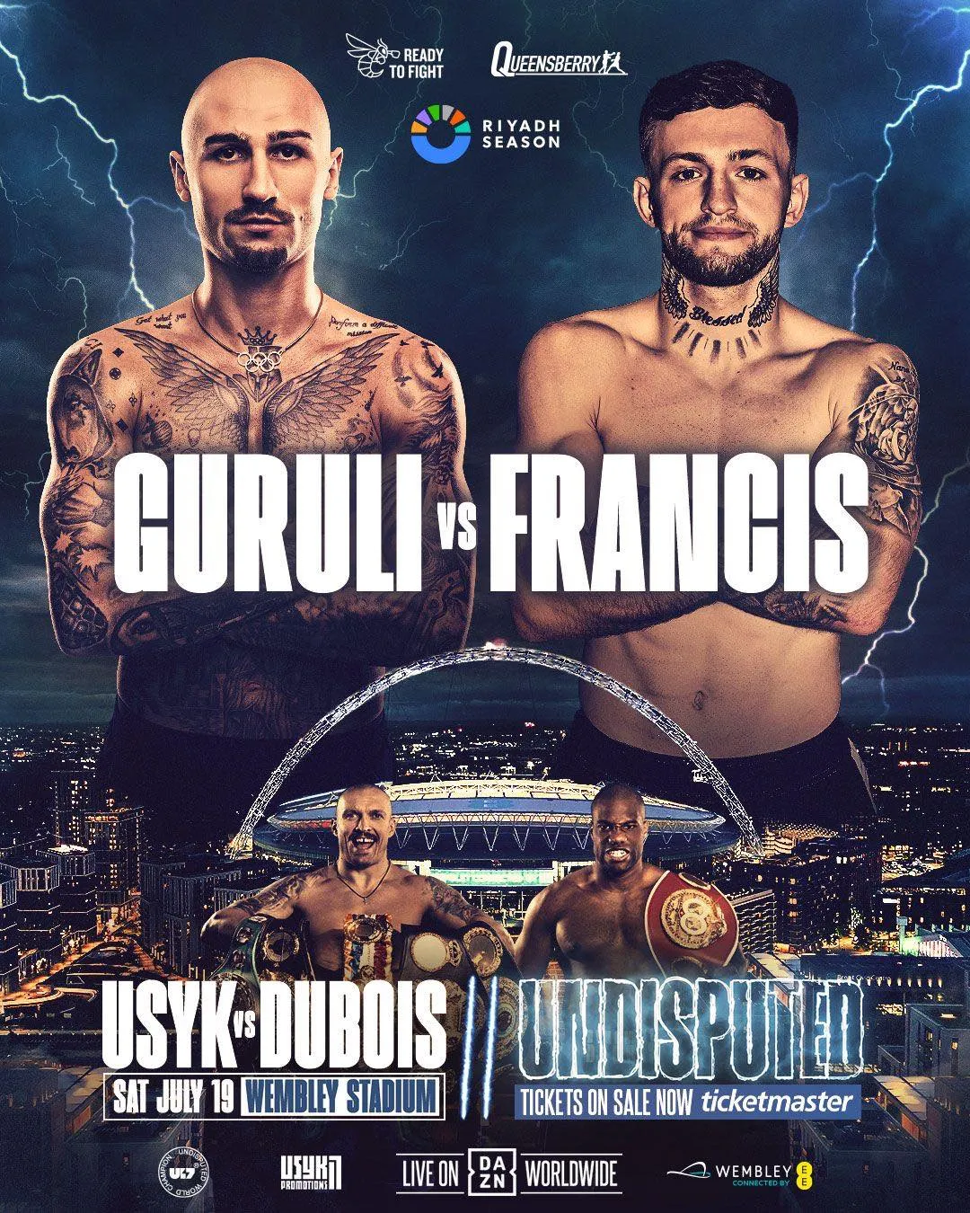 ცნობილია, რომ გურულისა და ფრენსისის დაპირისპირება 19 ივლისს, ლონდონში, უემბლის სტადიონზე შედგება. საღამოს მთავარი ბრძოლა კი ოლექსანდრ უსიკსა და დანიელ დუბუას შორის გაიმართება.