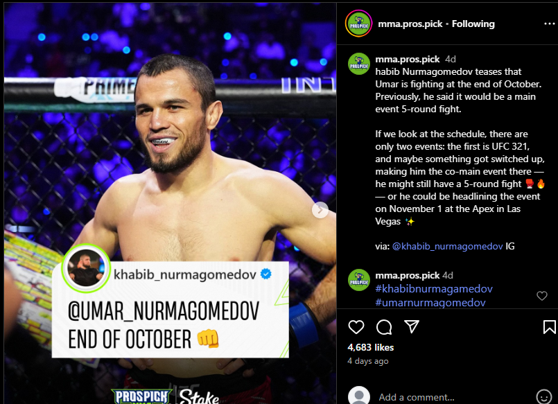 გარდა ამისა, თავად უმარმა და ხაბიბ ნურმაგომედოვმა დაადასტურეს, რომ დაღსტანელი მებრძოლი შემდეგ დაპირისპირებას 26 ოქტომბერს ჩაატარებს.