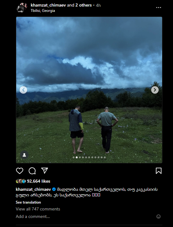 "მადლობა მთელ საქართველოს. კავკასიის გული არსებობს, ეს საქართველოა", - წერს ჩიმაევი სოციალურ ქსელში.