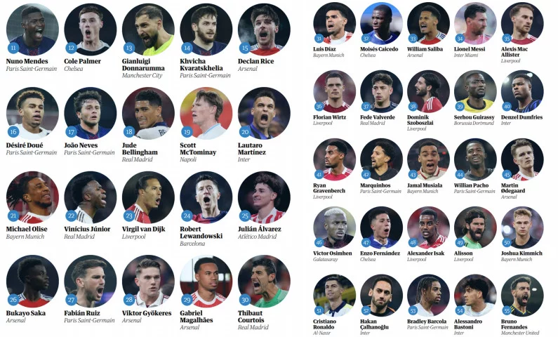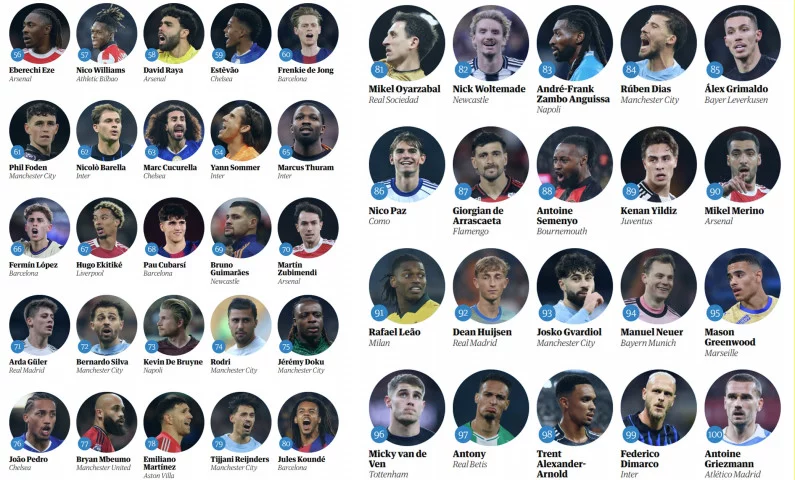 ცნობილი ბრიტანული გამოცემა, The Guardian, საკუთარ ვებგვერდზე ყოველწლიურ რეიტინგს აქვეყნებს და მსოფლიოს საუკეთესო 100 ფეხბურთელს ასახელებს.