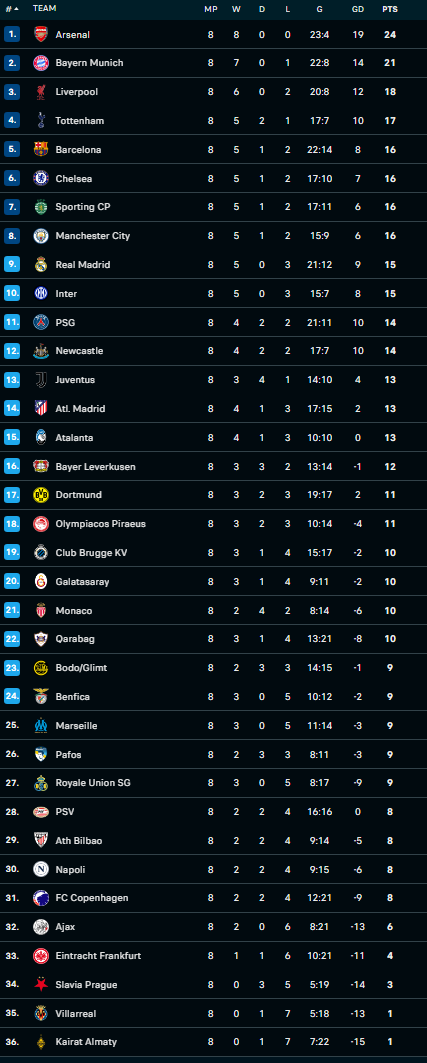 გთავაზობთ ჩემპიონთა ლიგის ცხრილს 8 ტურის შემდეგ.